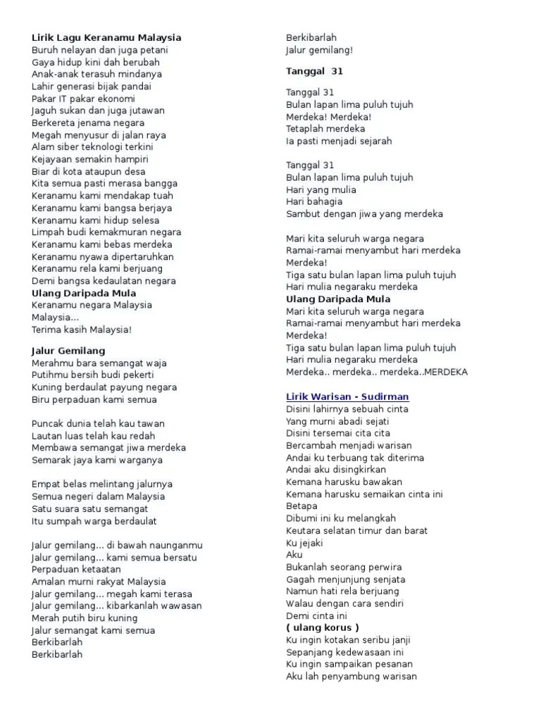 Lirik Lagu Keranamu Malaysia - Lirik Lagu Satu 1 Malaysia. Buruh, nelayan dan juga petani. Gaya hidup kini dah berubah. Buruh, nelayan dan juga petani. Gaya hidup kini dah berubah chorus buruh nelayan dan juga petani. ٥ ذو الحجة ١٤٣٨ هـ. Buruh, nelayan dan juga petani.